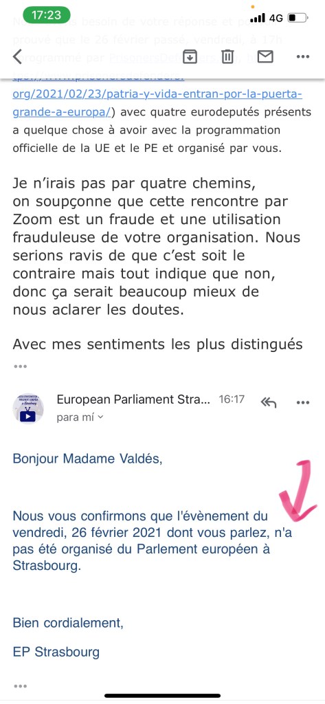 Según respuesta de la cuenta oficial del Parlamento Europeo, (que adjuntamos) recibida hoy en contesta a nuestra pregunta (que también adjunto) dicho Parlamento asevera que el viernes 26 NO ORGANIZÓ el evento al que hacemos referencia en nuestra misiva.
