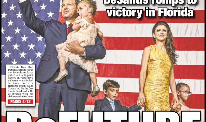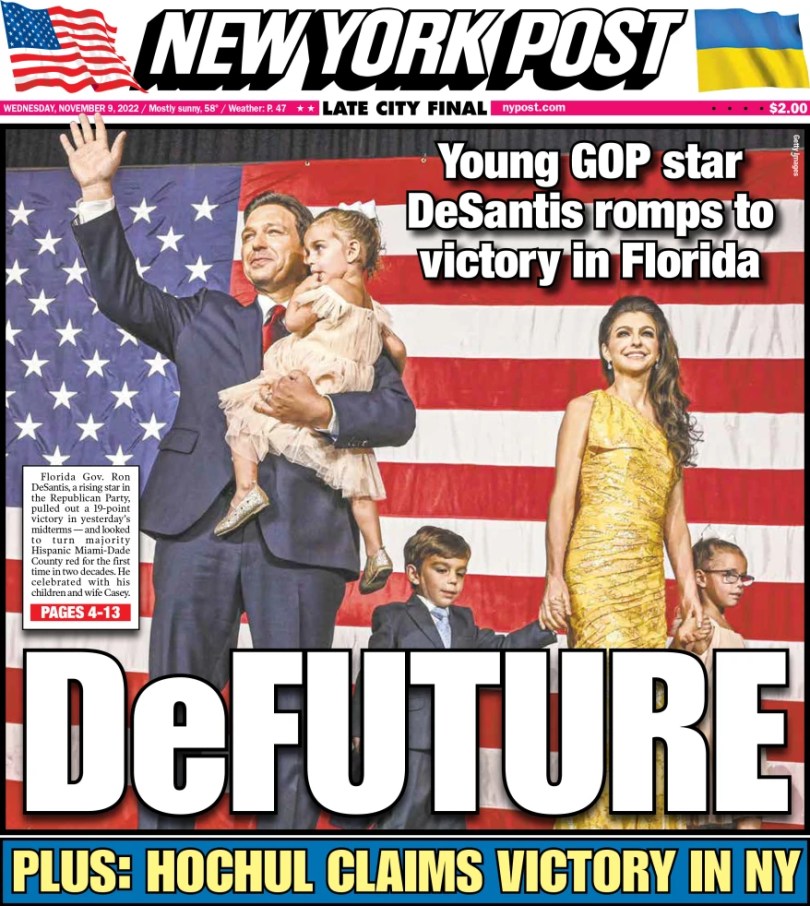 La portada del New York Post capturó la historia más destacada de la noche electoral en Estados Unidos. Presentaba a un jubiloso gobernador de Florida, Ron DeSantis , con su glamorosa esposa y tres lindos hijos. El titular decía: